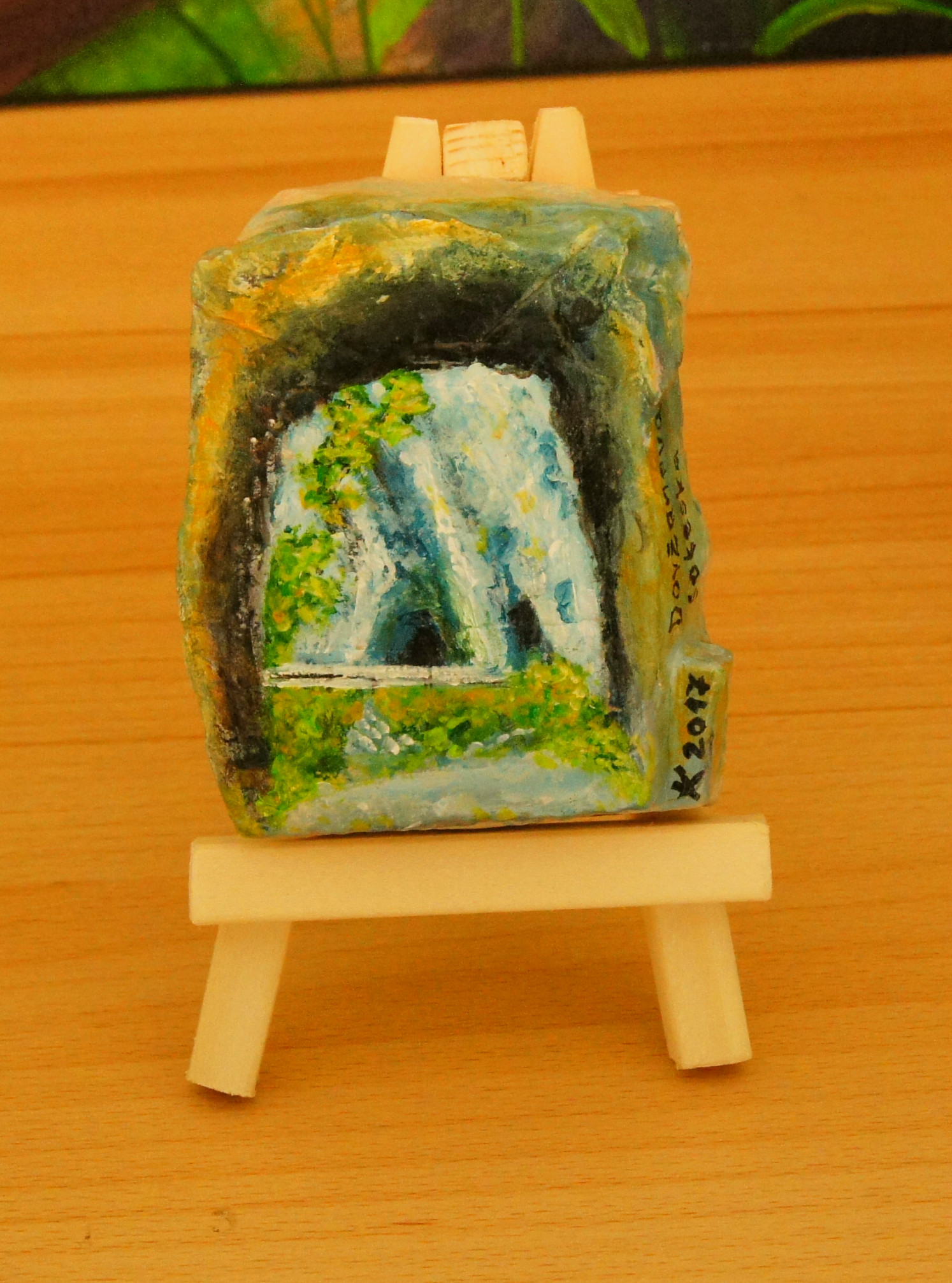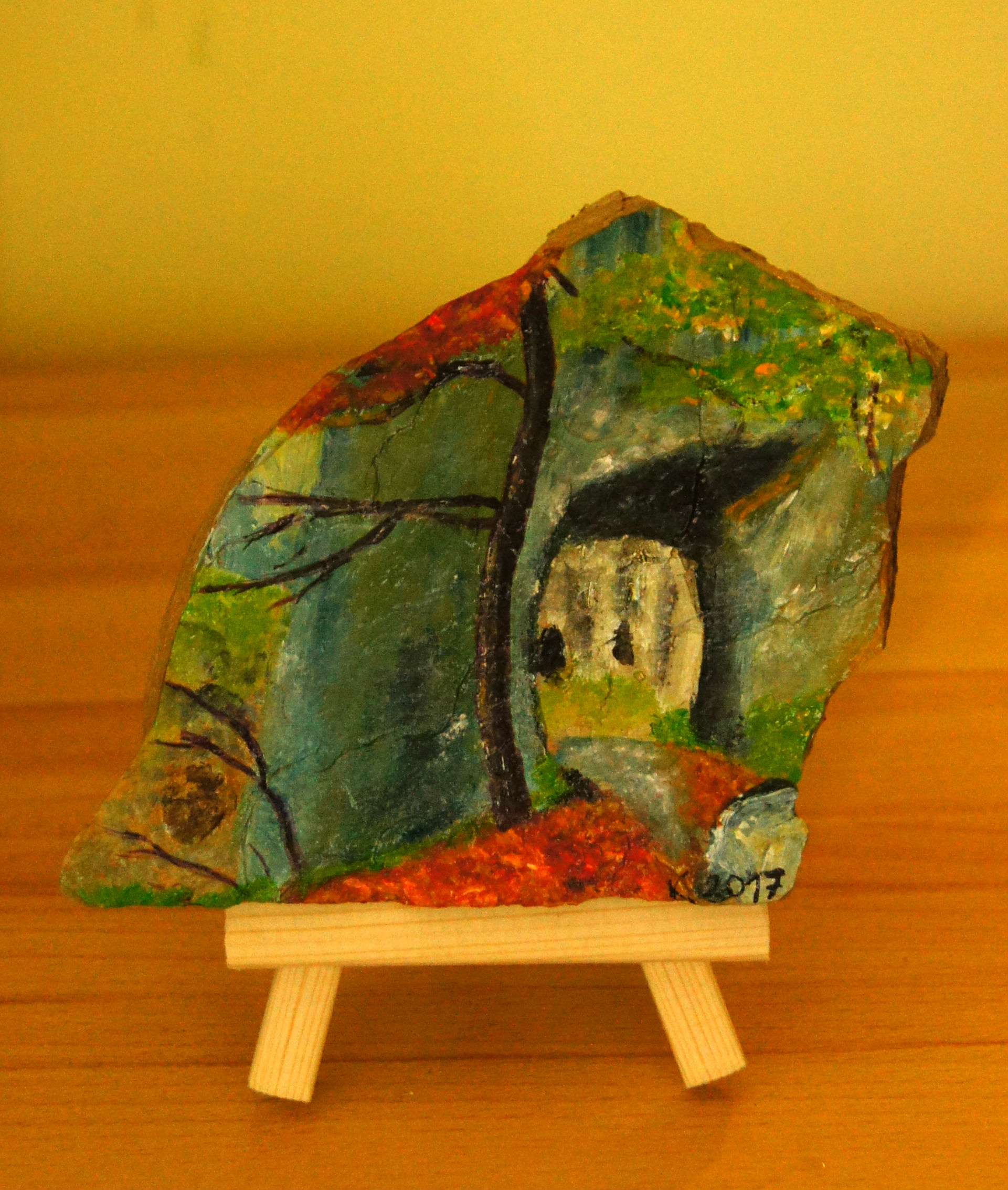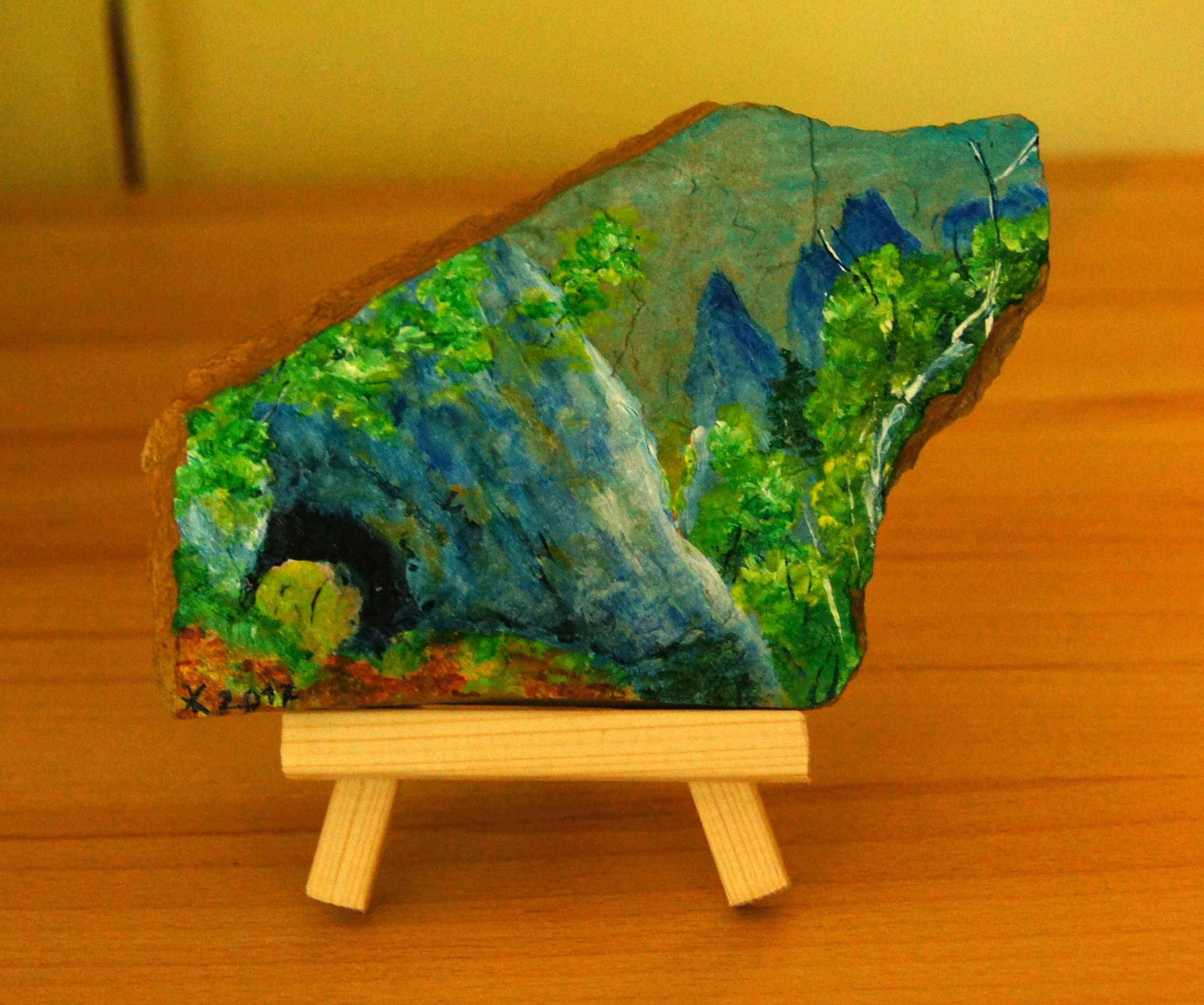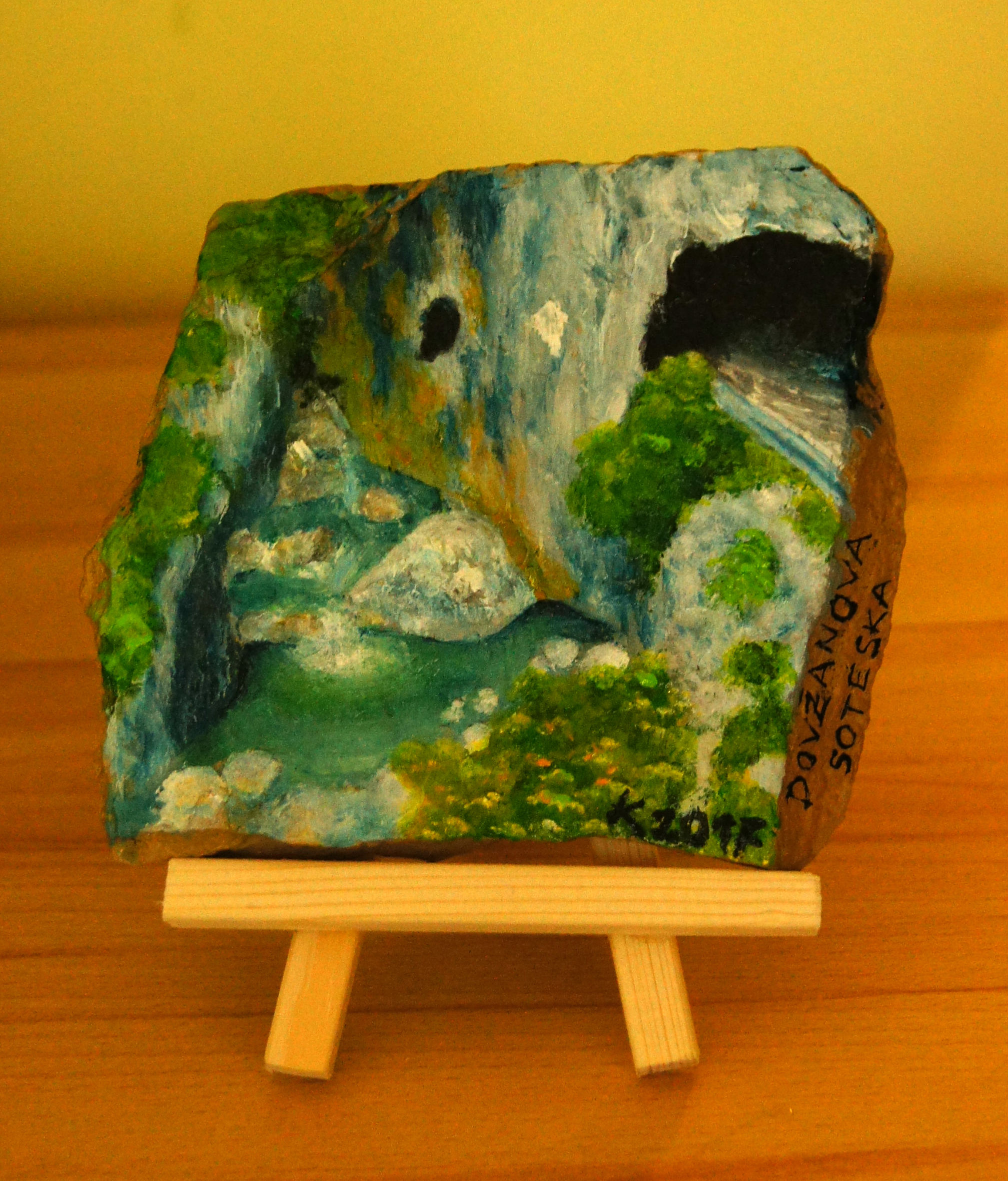 Različni motivi iz Dolžanove soteske, Tržič na lesenem stojalu. Akril na kamnu skrilavcu.