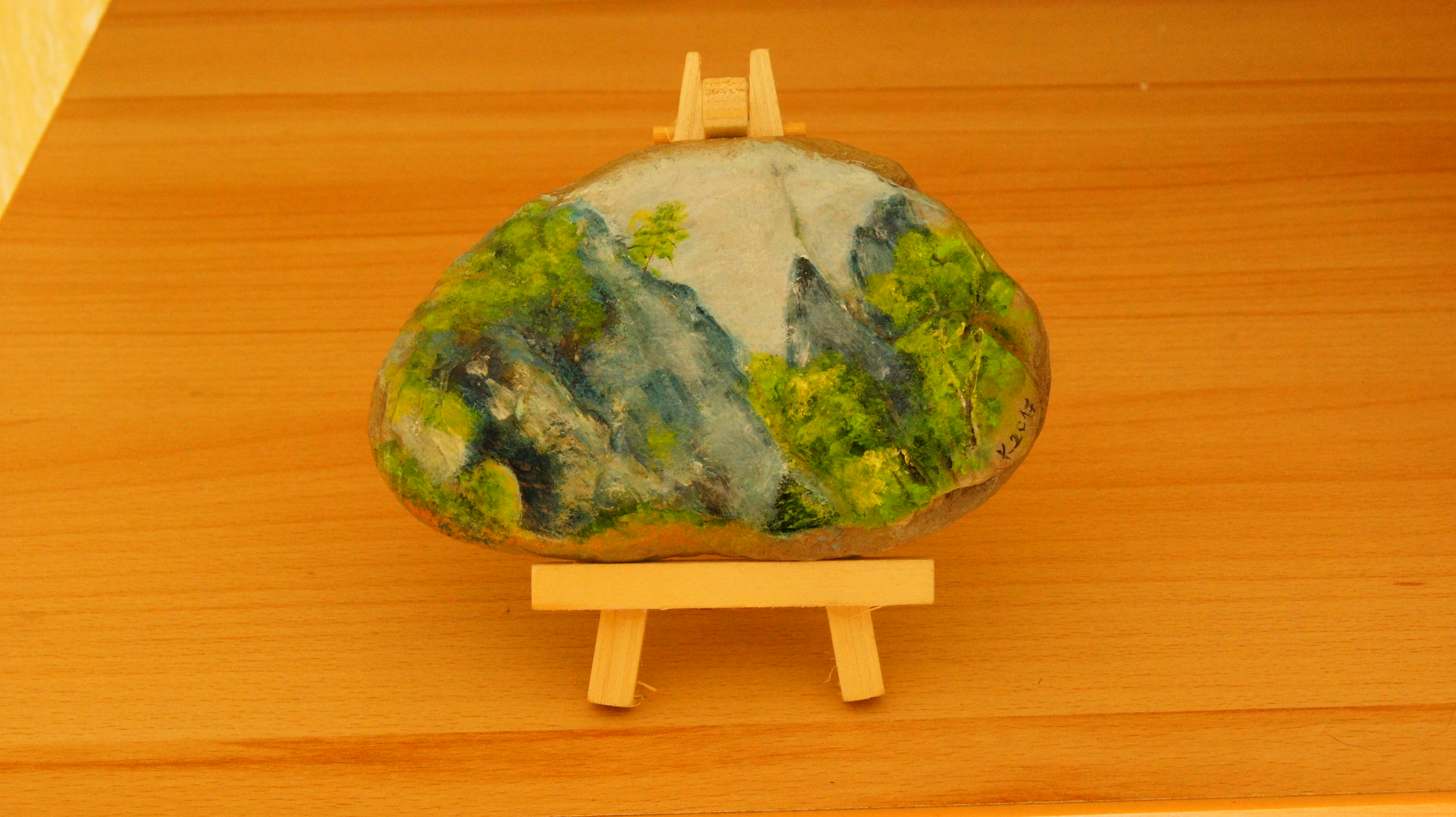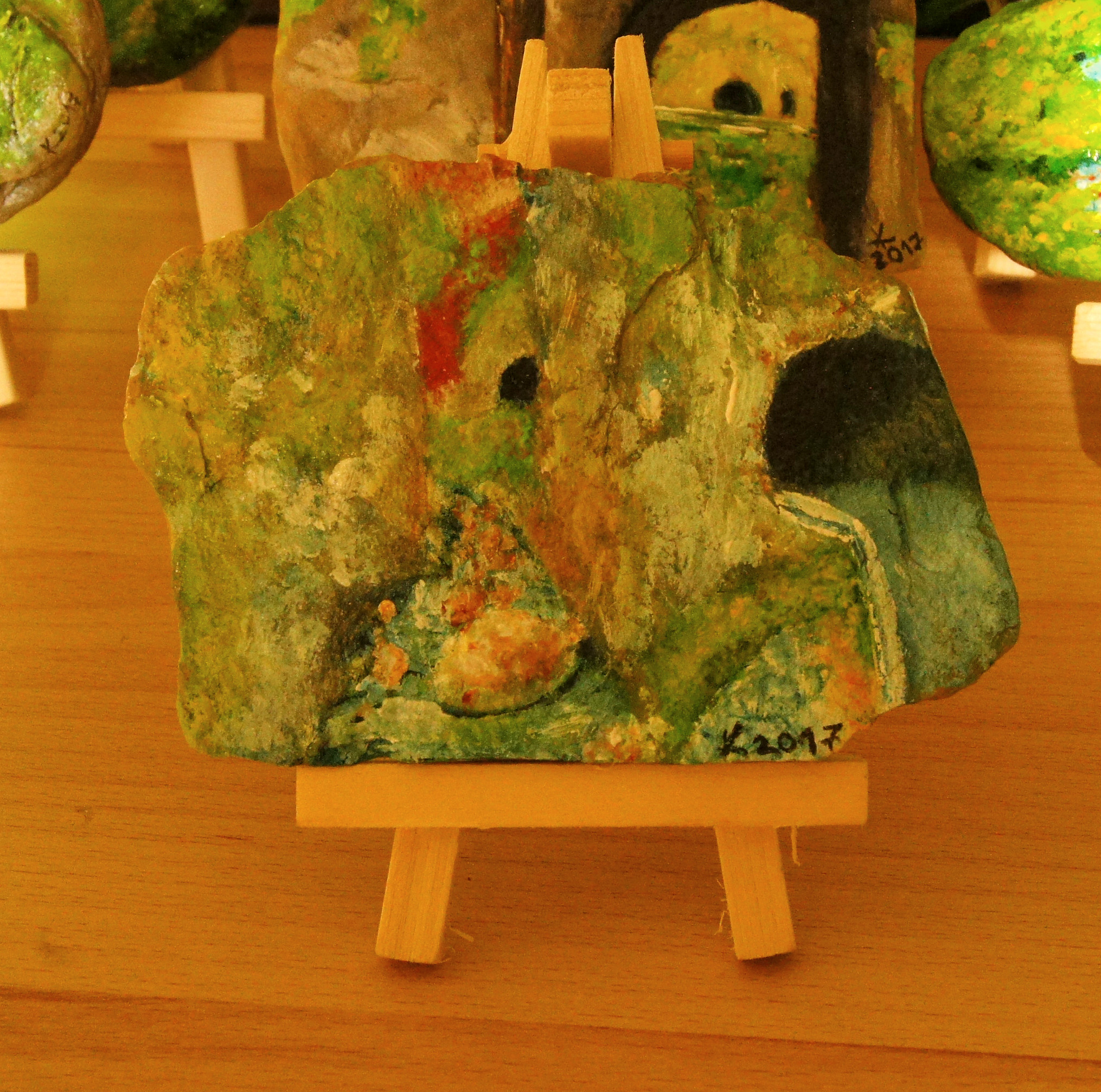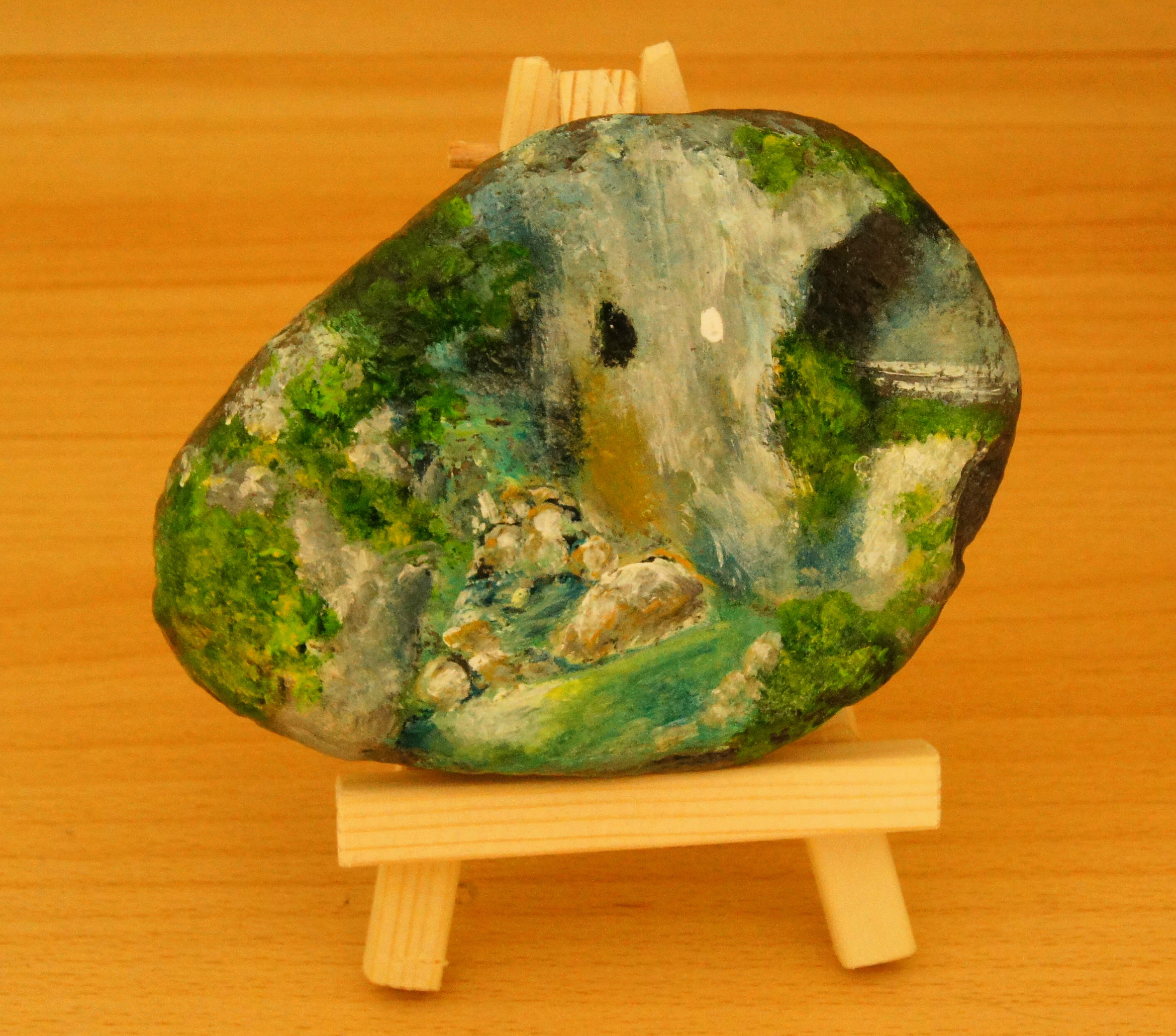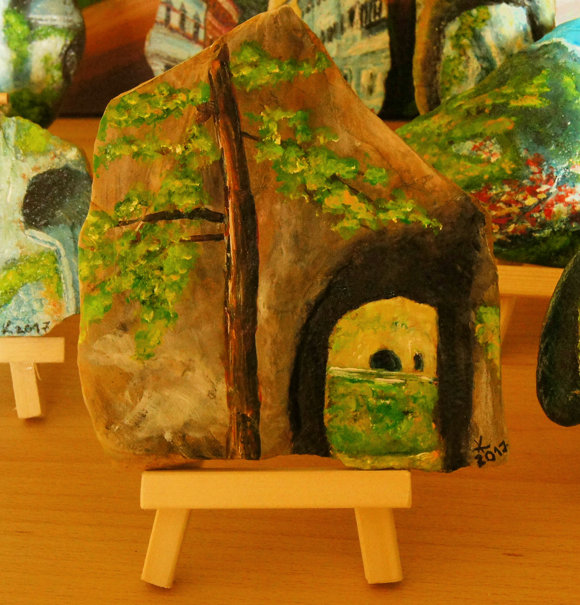 Različni motivi iz Dolžanove soteske, Tržič na lesenem stojalu. Akril na kamnu skrilavcu.