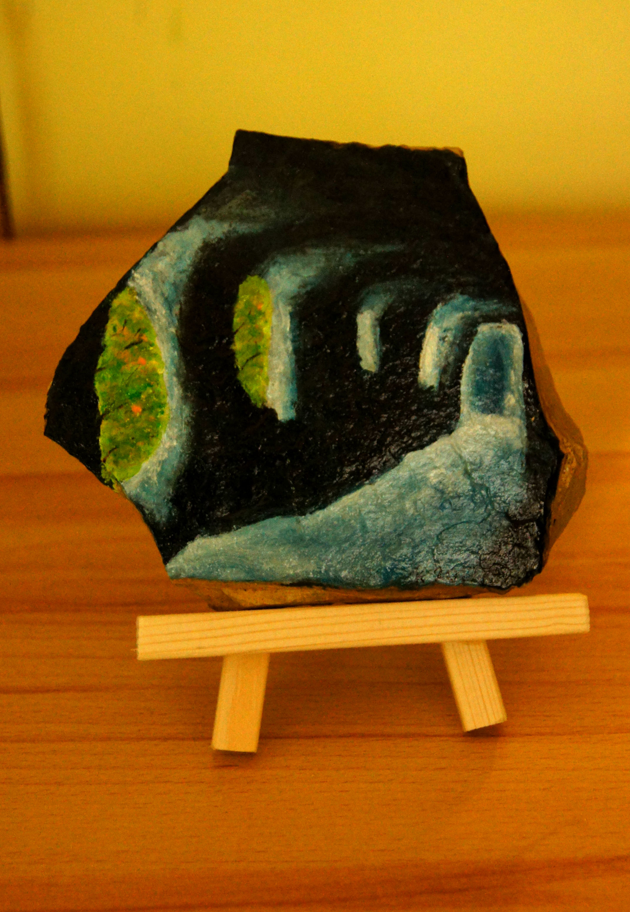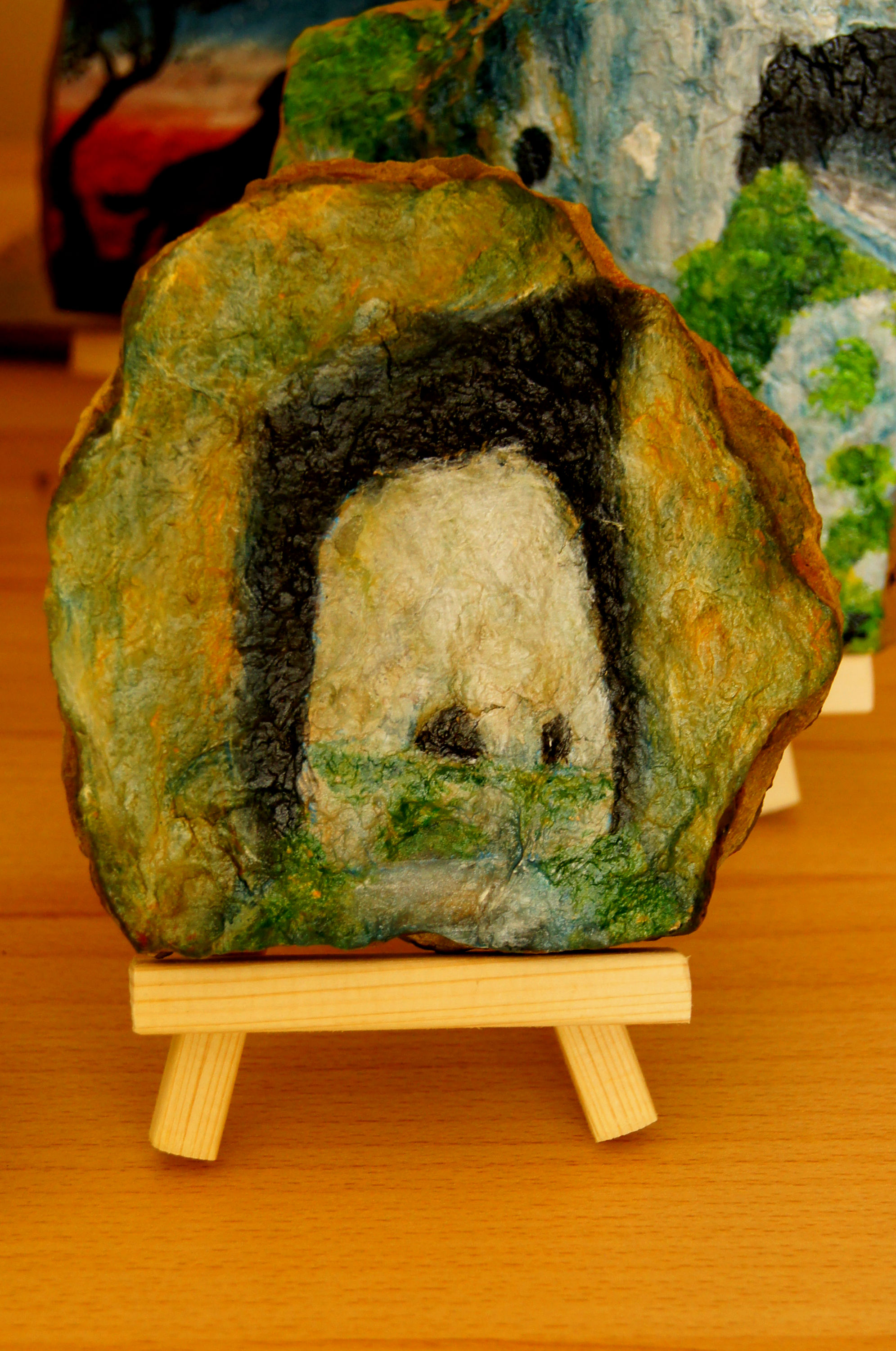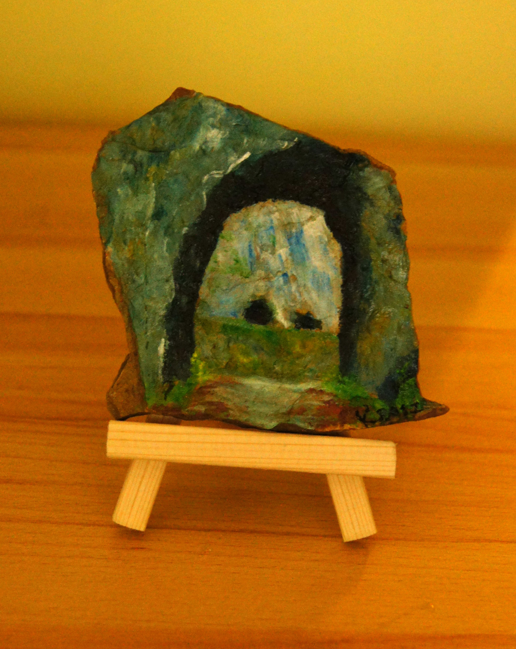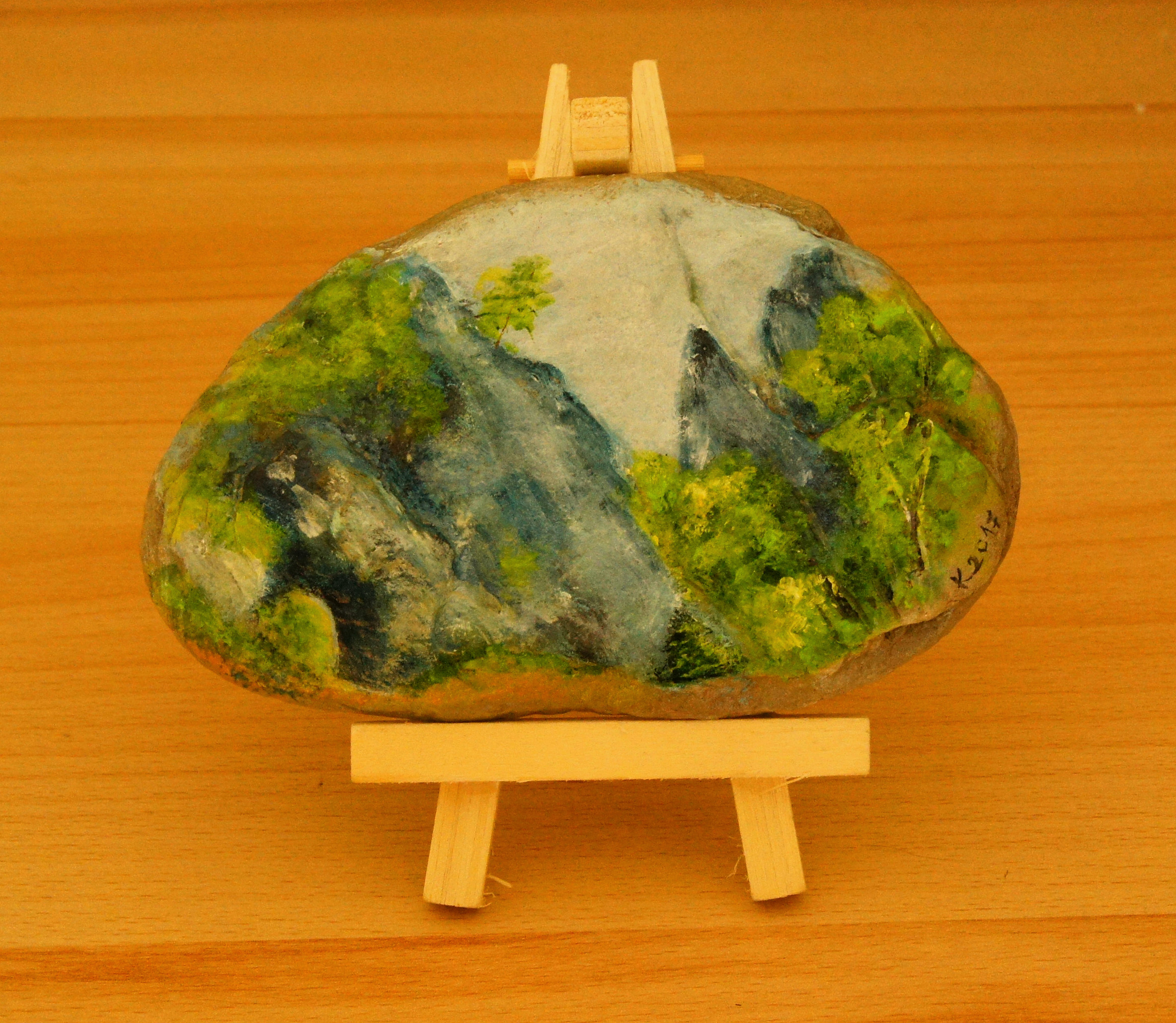 Različni motivi iz Dolžanove soteske, Tržič na lesenem stojalu. Akril na kamnu skrilavcu.