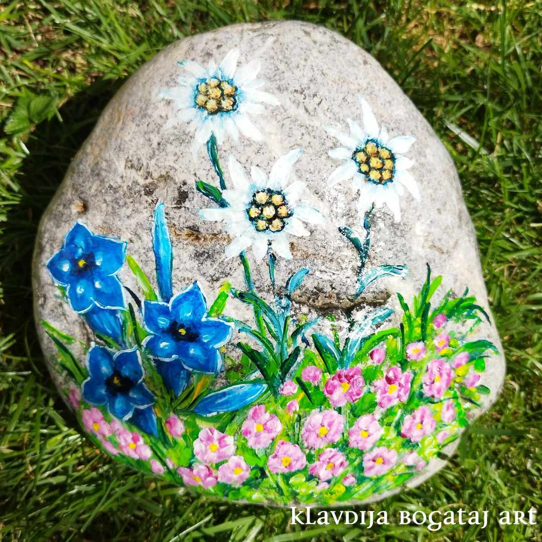 Planinsko cvetje, planika, encijan, naslikano na večji kamen, kot dekoracija skalnjaka v vrtu. Lahko nam polepšajo tudi vhod v hišo ali kot dekoracija grobov. Poslikano kamenje je unikatna dekoracija ali lepo darilo za rojstni dan.