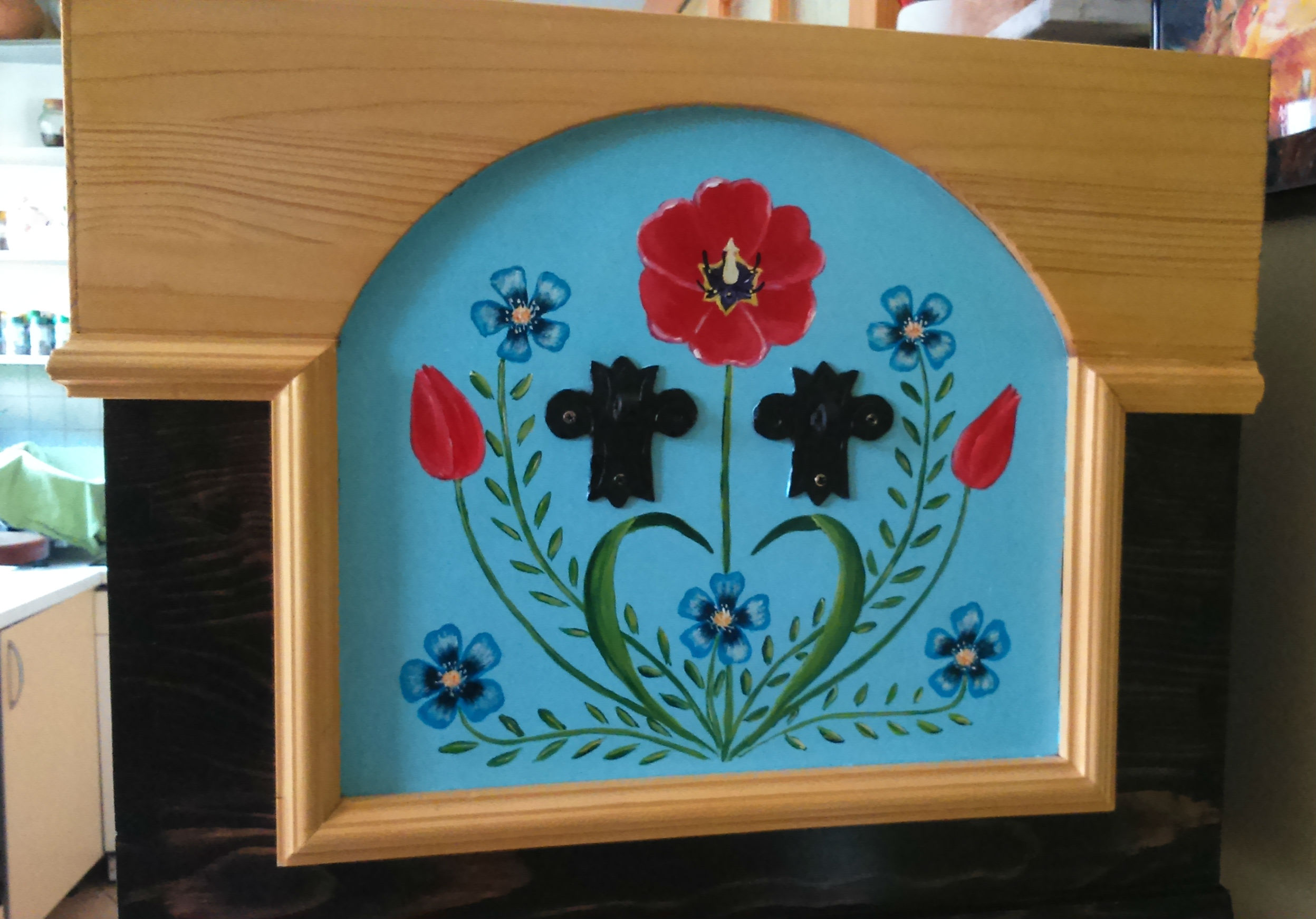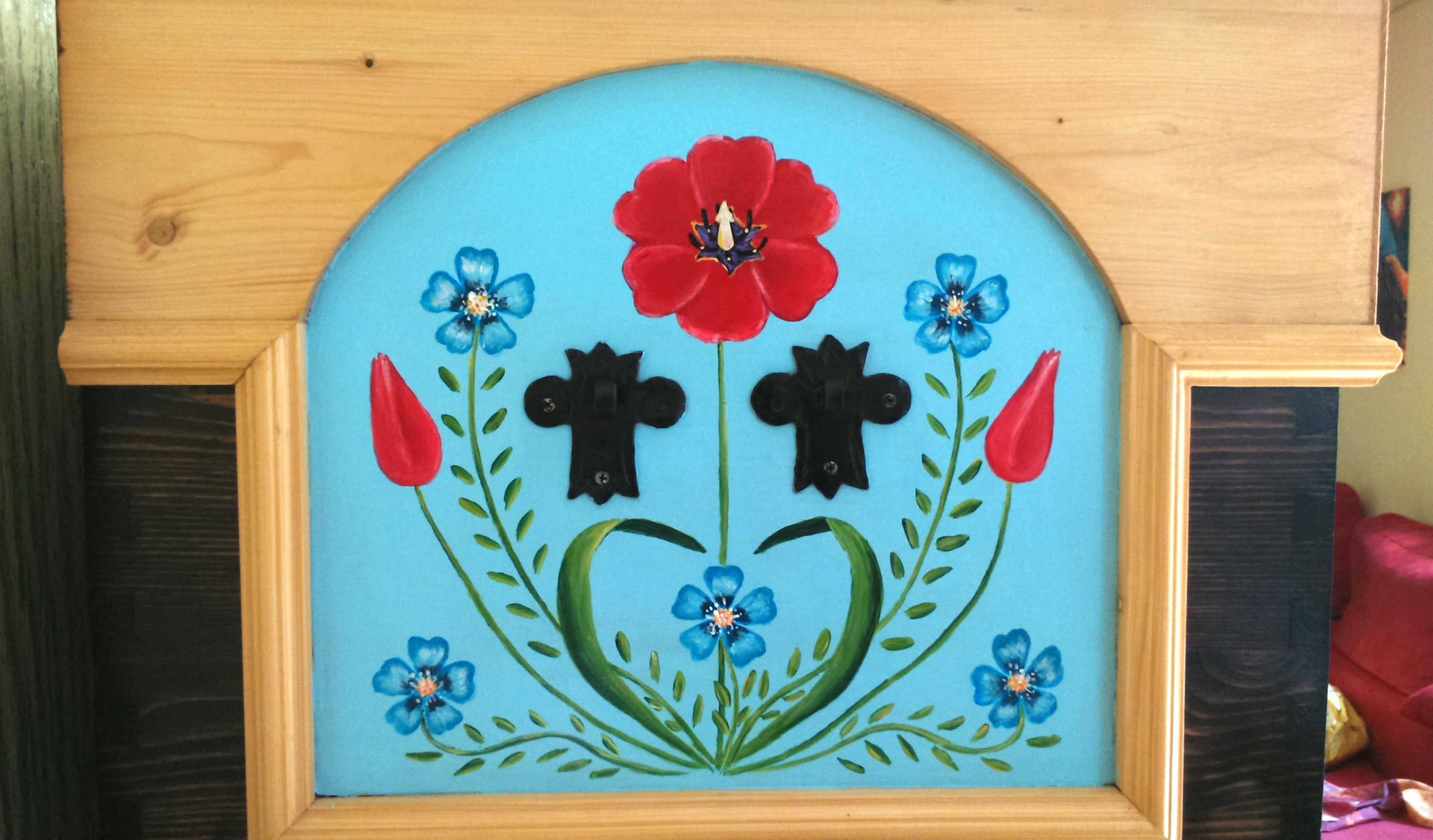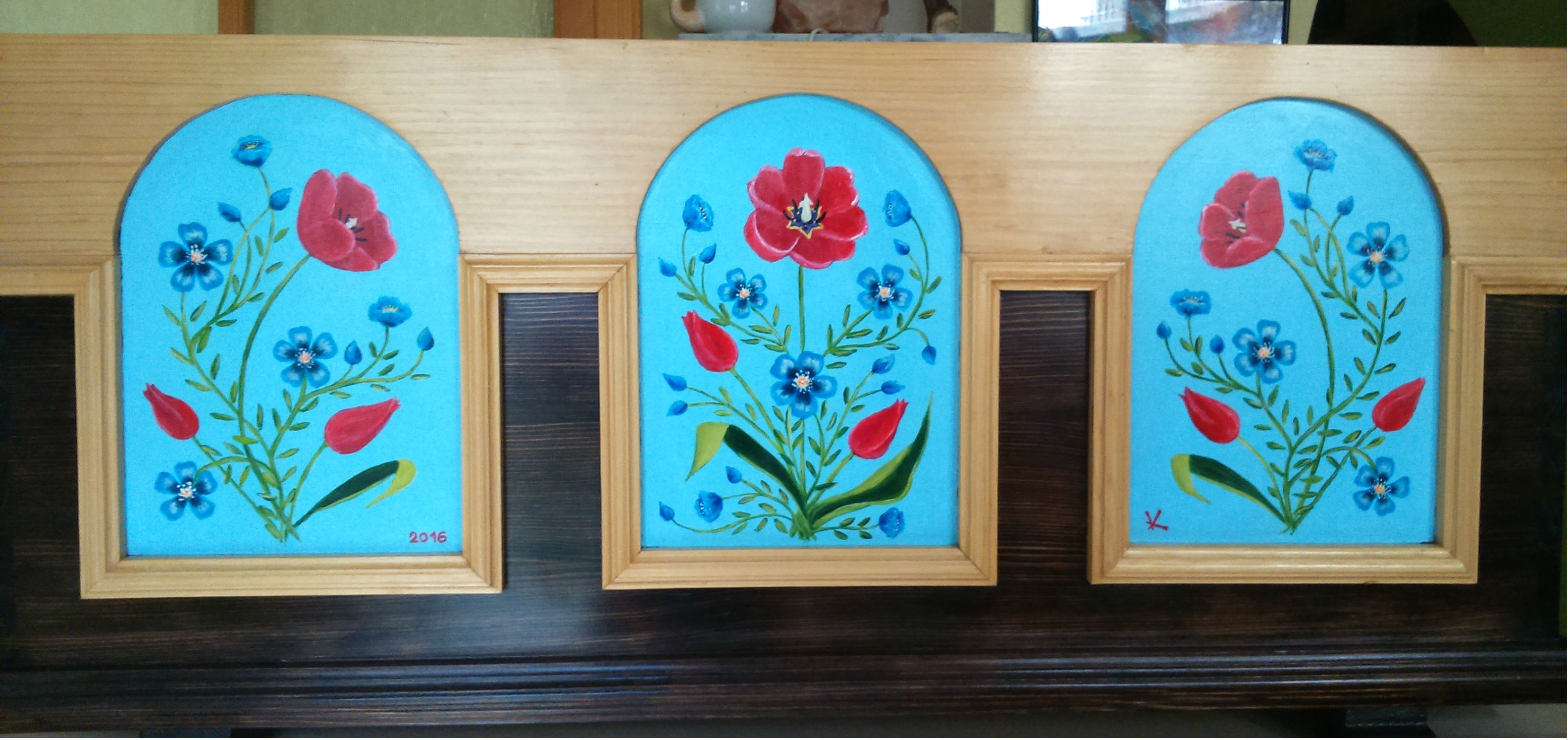 tulipan in modre rože, poslikava lesene skrinje, akril