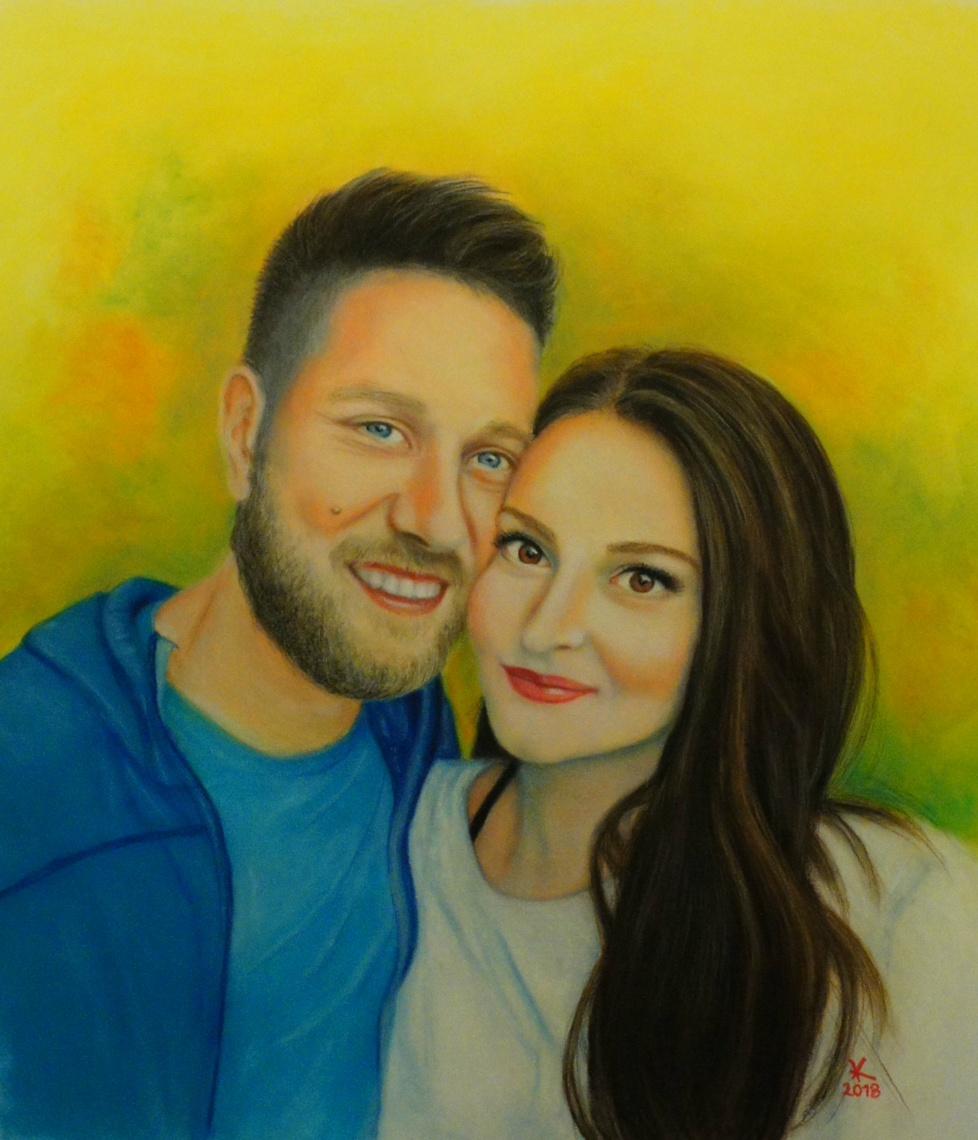 Barvni portret para kot darilo za poroko. Suhi pastel na papirju velikost 50x60cm.