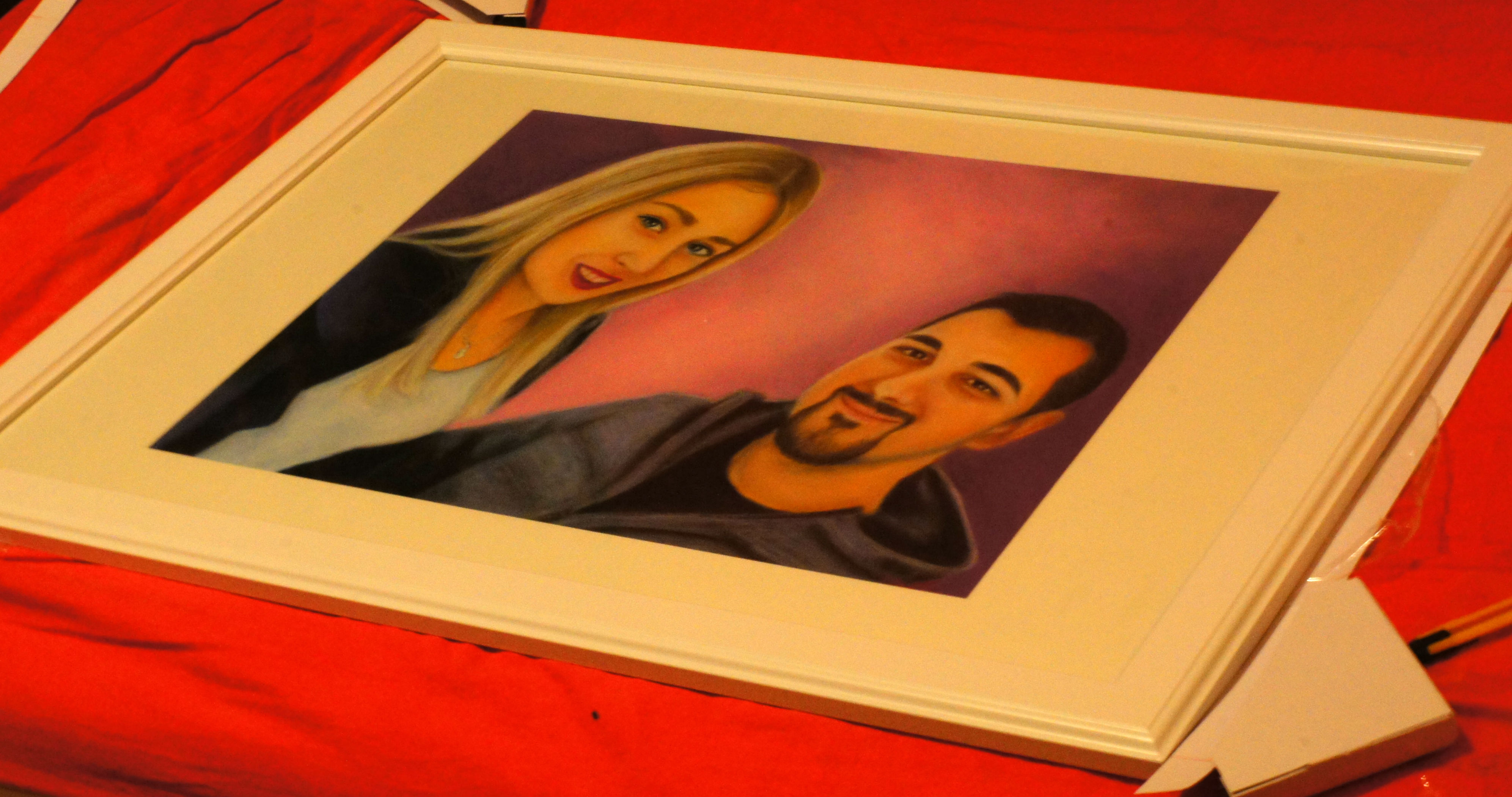 Barvni portret para kot darilo za poroko. Suhi pastel na papirju velikost 50x60cm.