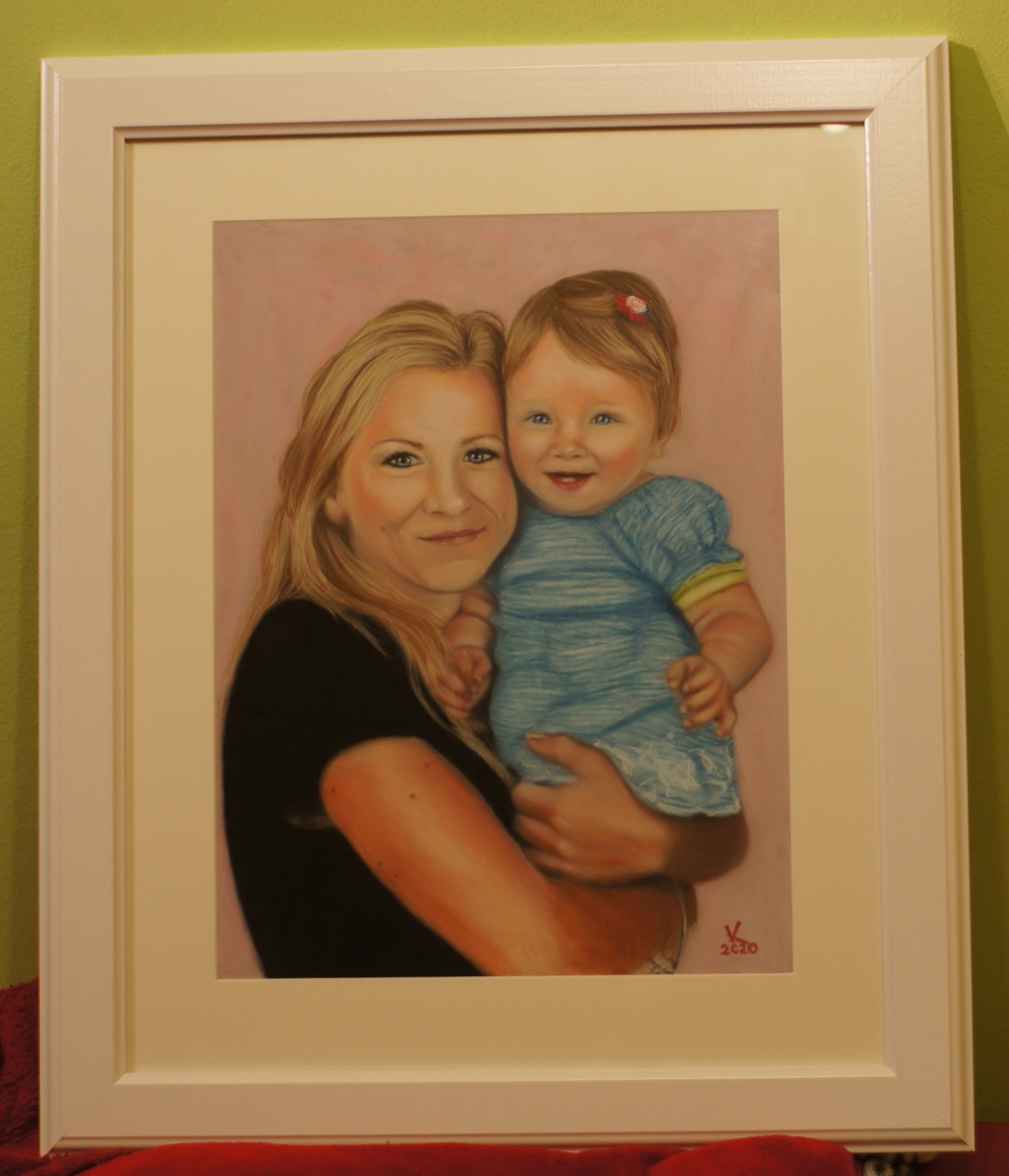 Portret mamice in hčerkice, suhi pastel 30x40 cm. Slika je narejena po poškodovani fotografiji. Tudi tako se lahko obnovi lep spominček, če je prvotna fotografija v slabšem stanju.