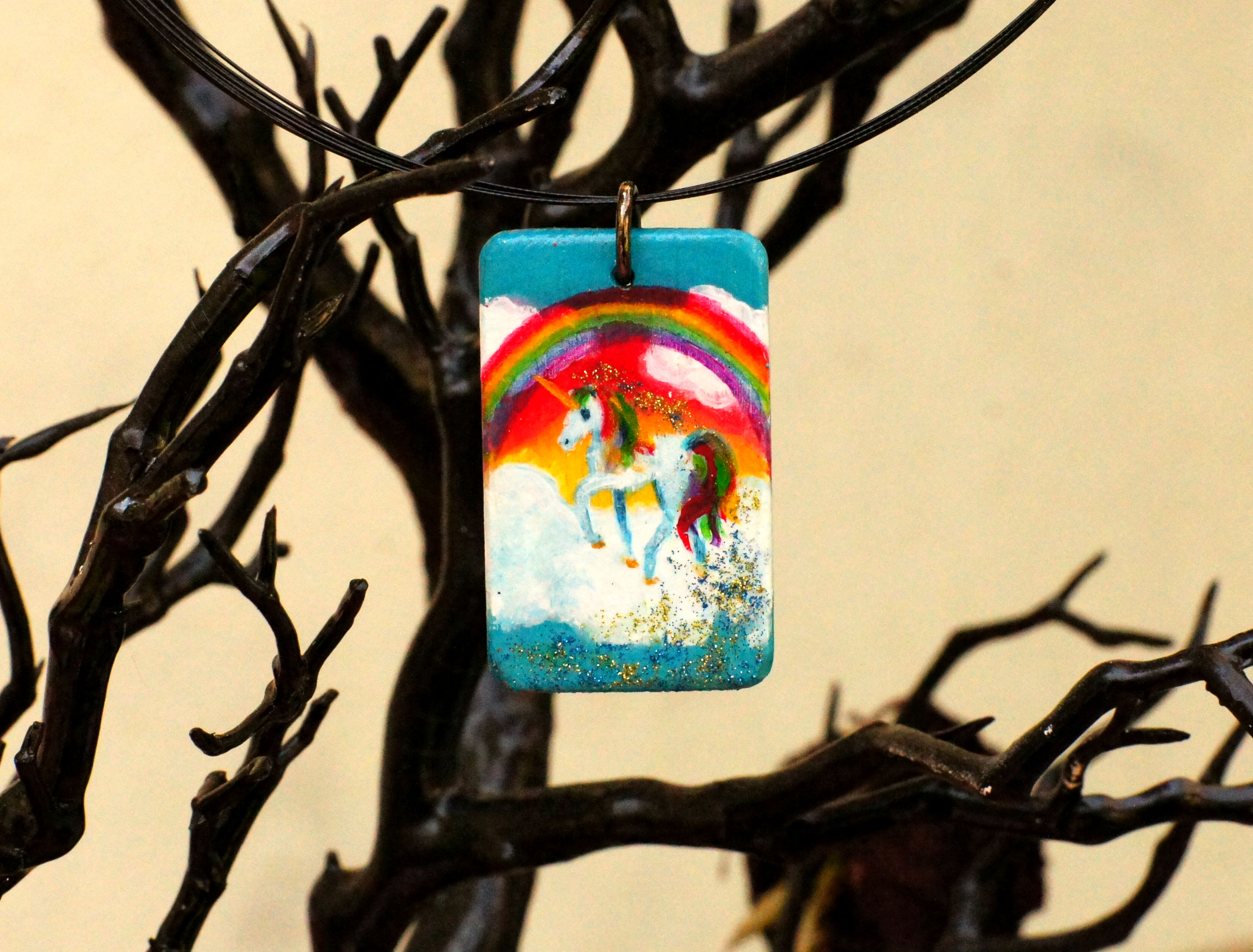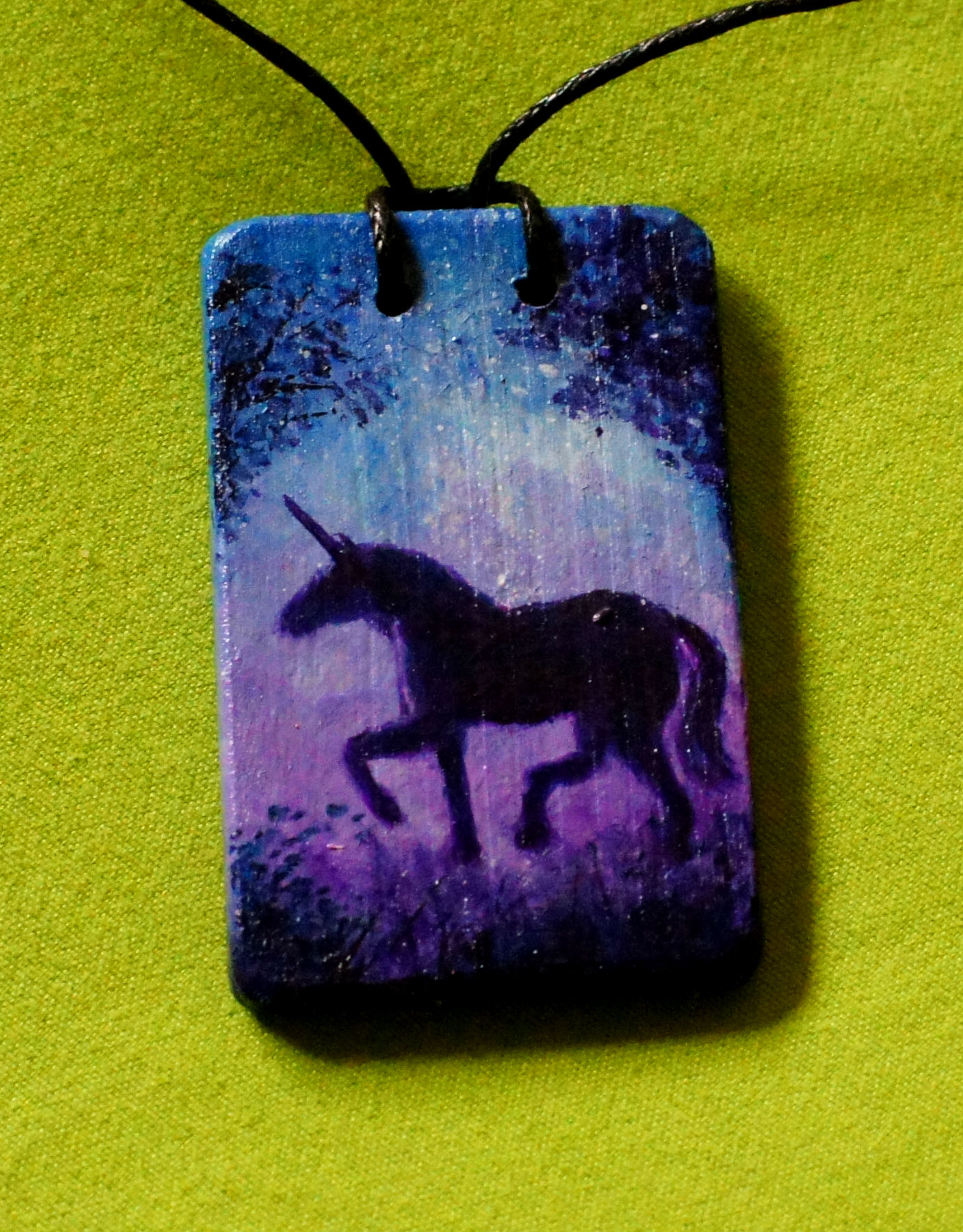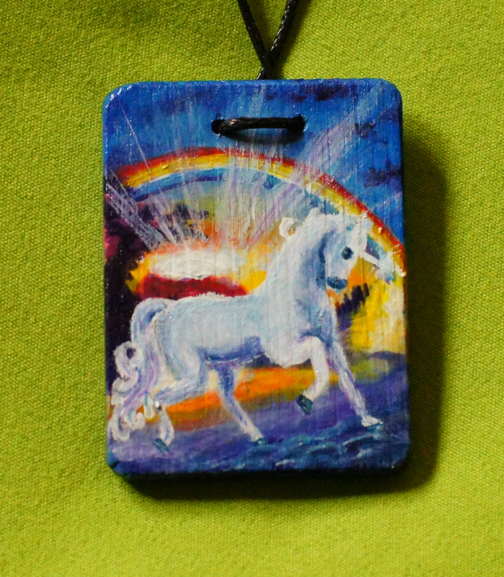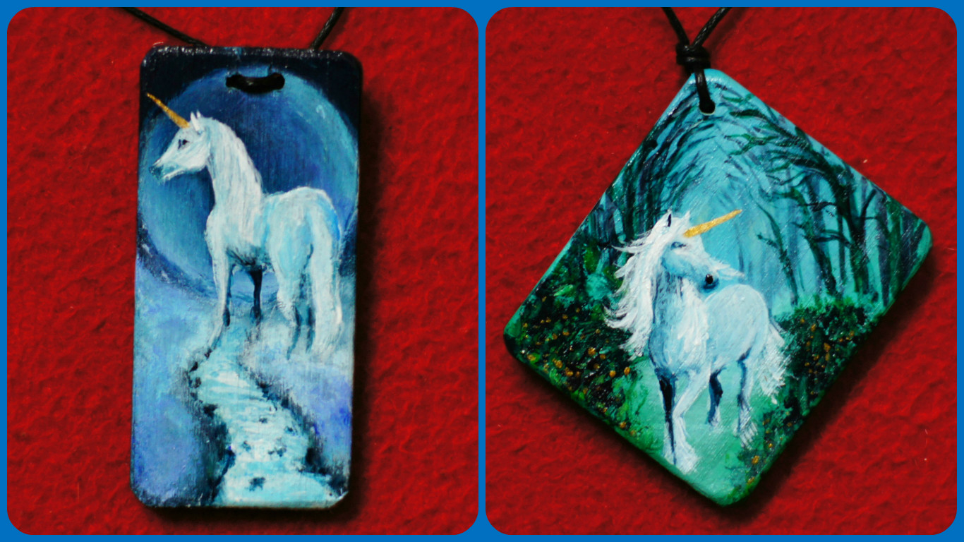 Motiv samoroga na lesu. Vsak izdelek je ročno delo in je unikaten. Nekatere ogrlice so še na voljo. Če niso, vam naslikam motiv po vaši želji. Velikost obeska iz lesa ali kamna je po dogovoru. Na zatezni vrvici ali okrogli plastični ogrlici.