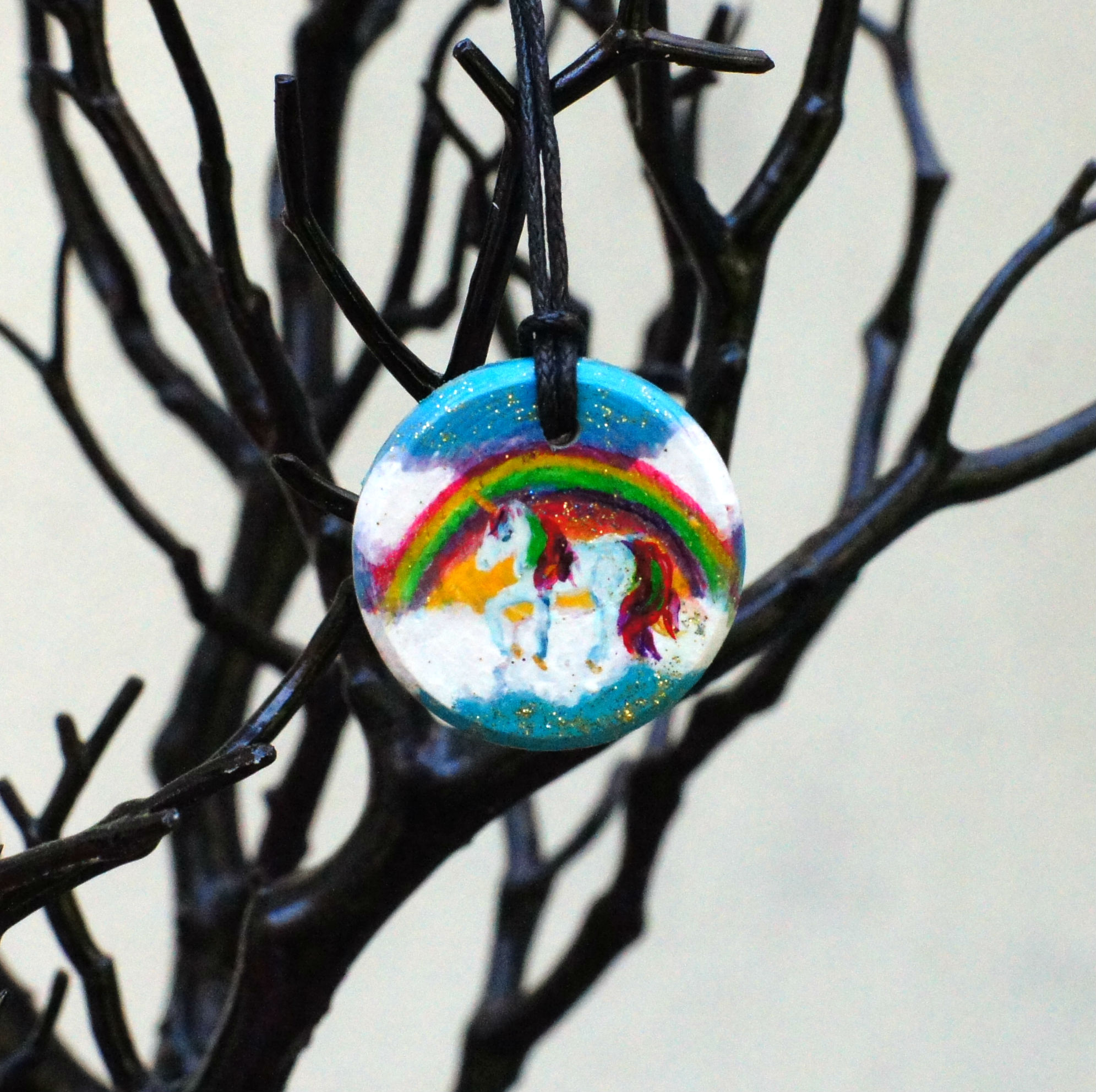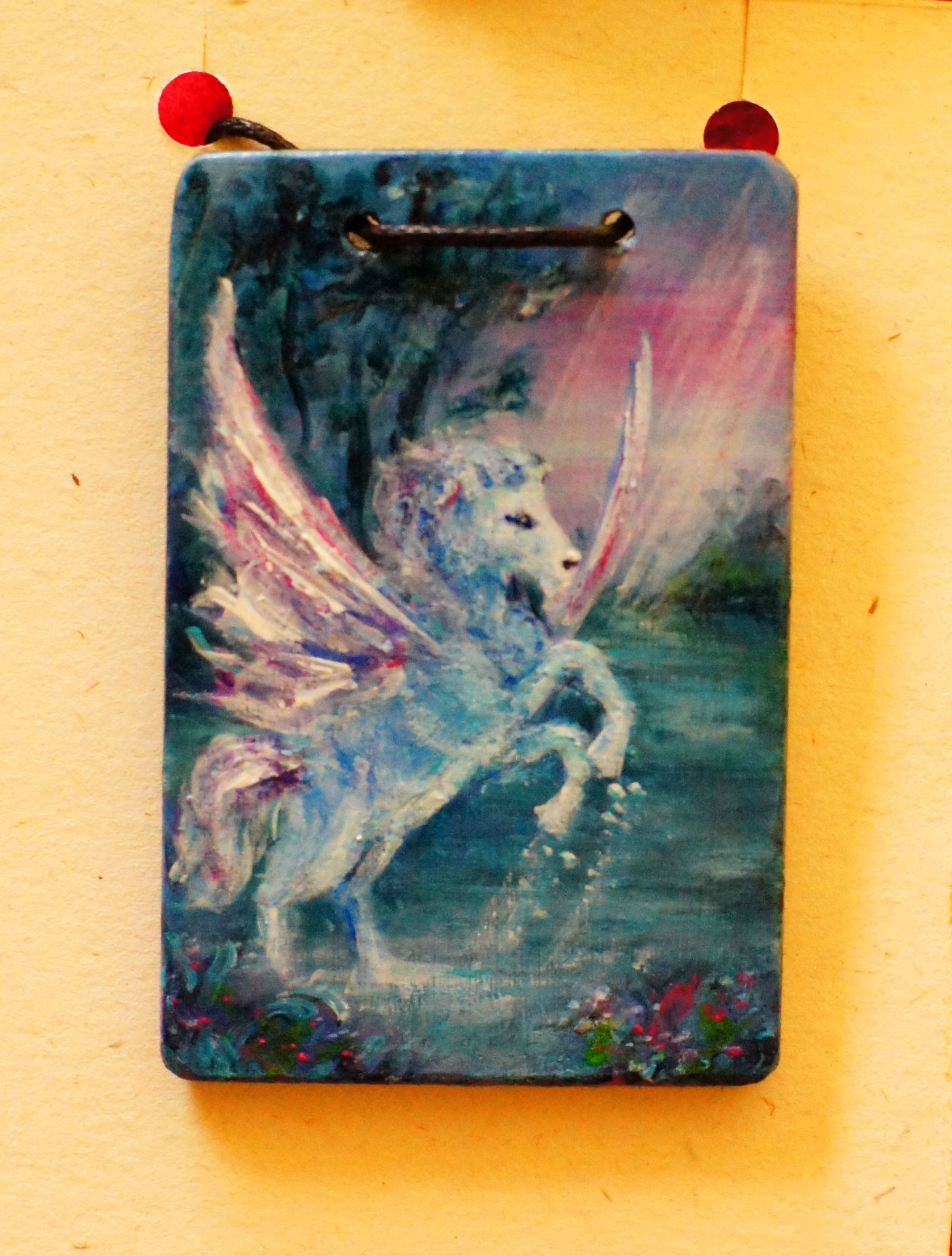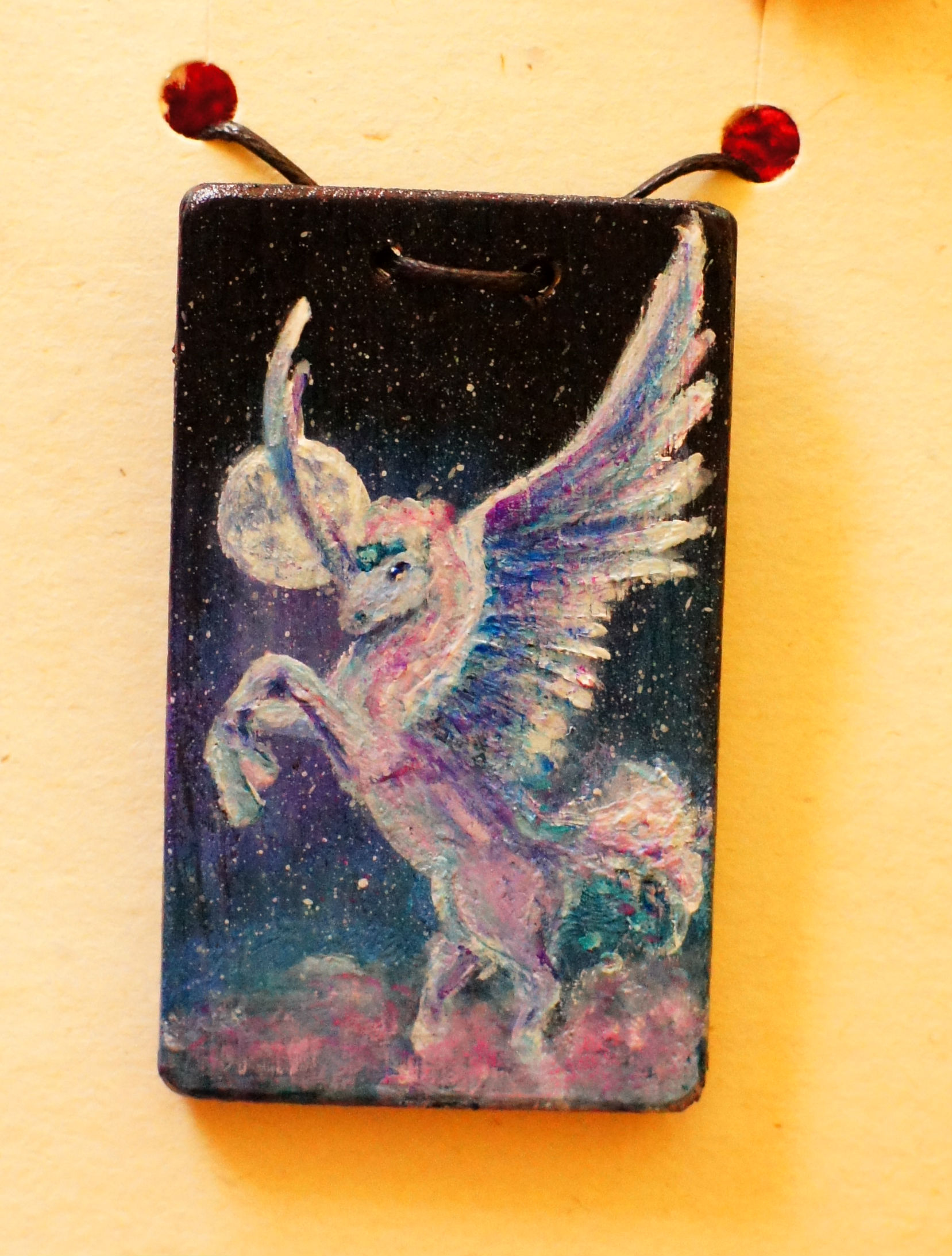Motiv samoroga na lesu. Vsak izdelek je ročno delo in je unikaten. Nekatere ogrlice so še na voljo. Če niso, vam naslikam motiv po vaši želji. Velikost obeska iz lesa ali kamna je po dogovoru. Na zatezni vrvici ali okrogli plastični ogrlici.